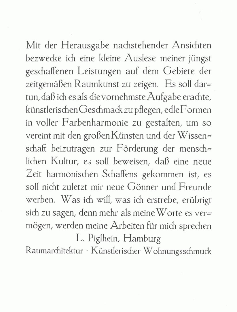 Im Jahre 1906 traten LUDOVICUS PIGLHEIN’s Söhne HENRY und ROBERT PIGLHEIN, in die Firma ein. Es war ihnen nur kurze Zeit vergönnt, gemeinschaftlich mit ihrem Vater zu wirken, welcher 1907 verstarb. Während sich Henry Piglhein ausschließlich der kaufmännischen Leitung widmete, blieb es Robert Piglhein, welcher nach praktischer Vorbildung Kunstgeschichte und Architektur auf der Karlsruher Technischen Hochschule studierte und in Berliner Büros namhafter Architekten praktiziert hatte, vorbehalten, der Firma einen neuen außerordentlichen Aufschwung zu geben. - Aufträge, wie die Neuausstattung des abgebrannten Teils des Schweriner Schlosses, wurden durch die innerpolitische Umwälzung 1918 zunichte gemacht. - Zusammen mit seinem aus dem Bildhauerberuf hervorgegangenen Mitarbeiter Hans Behnke wurden viele Ausstattungen reicher Bürgerhäuser und Landsitze geschaffen, und diese trugen dazu bei, den Ruf des Unternehmens immer mehr zu erweitern.