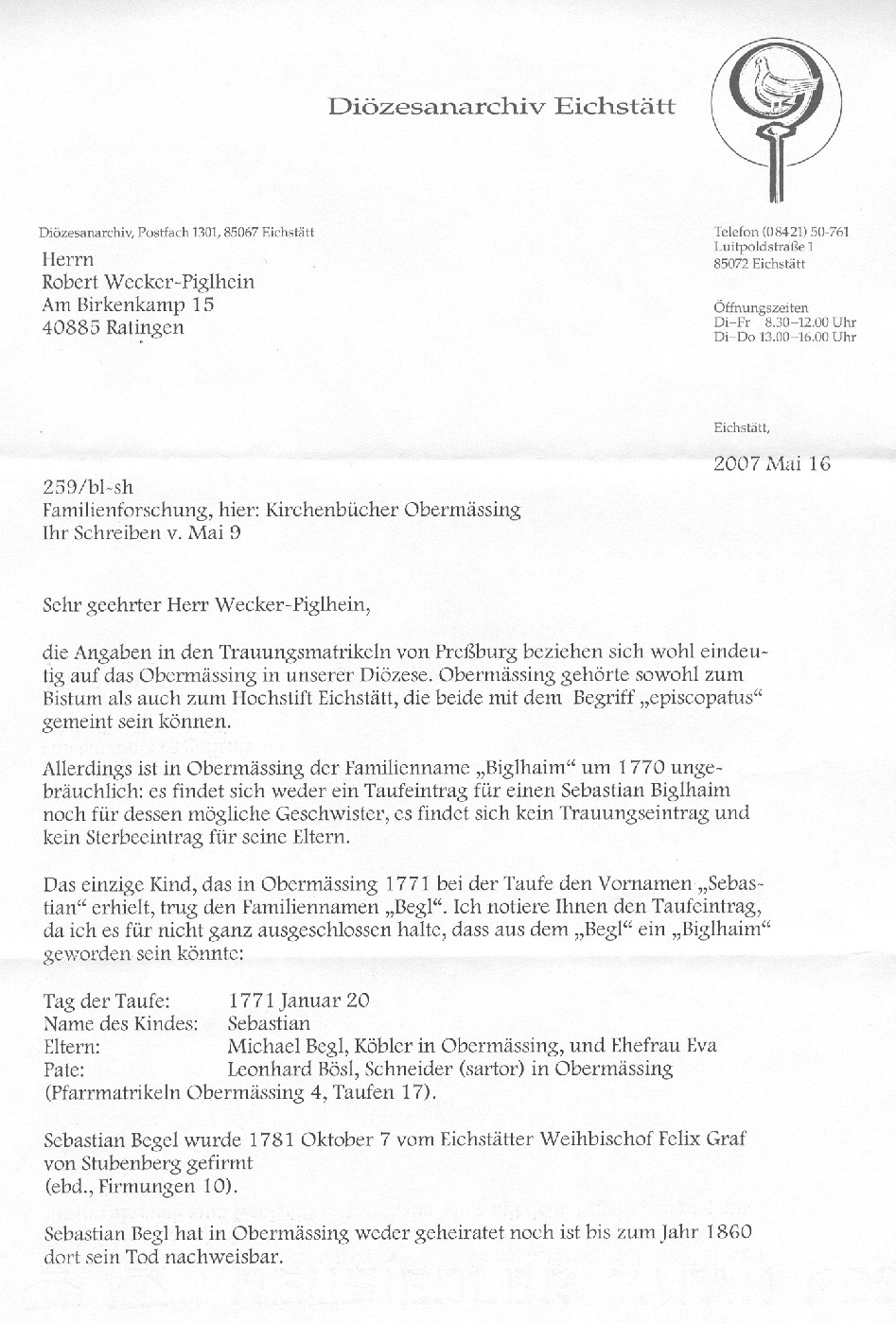 | In der o.a. Ortsangabe "Obermessin Episcopatus Achstädtensis in Imperio" bezieht sich laut Aussage von Diözesenarchivar Dr. Bruno Langenfelder das Wort "Imperio"auf das Heilige Römische Reich. Frau Dr. Buzinkayova in Bratislava übersetzte es irrtümlicherweise als "Österreich" der KuK-Monarchie. |